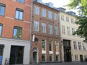 The number of residents had increased to 21 by 1845. The now-widowed Christiane Elisabeth Amundsen was still residing with her four children on the ground floor.[9] J. Petersen, a courier working for Rentekammeret, was also residing on the ground floor with his two children (aged 13 and 15) and a maid.[10] Christian Ferdinand Christensen (1805–1883), a scenic painter at the Royal Danish Theatre, resided on the second floor with his wife Ida née Thaning, their four children (aged two to eight), his mother-in-law Hedevig Thaning and two maids.[11] Thomas Nielsen, a grocer (høker) resided in the basement with his wife Karen Marie Nielsen née Petersen and a maid.[12]