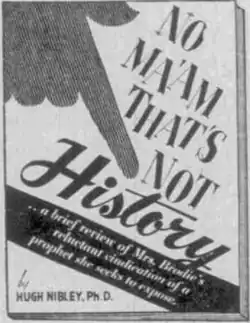 1. ^ a b Wolfson, Hannah (September 7, 1999). "Biographer Brodie Is the Subject Of a New Book". The Salt Lake Tribune. p. B4. In 1946, Brigham Young University [p]rofessor Hugh Nibley wrote a pamphlet called, No Ma'am, That's Not History, which picked apart [Fawn] Brodie's thesis and was wildly popular in Utah. Continued from Wolfson, Hannah (September 7, 1999). "Now We Know Her History". The Salt Lake Tribune. p. B1.