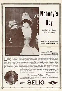 Nobody's Boy is a 1913 American silent film drama produced by Hardee Kirkland. The film stars Clarence Jonstone, Adrienne Kroell and Rose Evans. The film status is uncertain but a release flier survives which is now at the Margaret Herrick Library at the Academy of Motion Pictures Arts and Sciences, it was part of the Charles G. Clarke collection. Its reel was about 700 feet (210 meters) long. The film was released on the same reel with The Yosemite Valley in Winter.