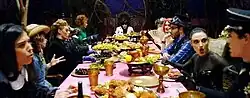 Jessie J sitting in a feast table referencing the Mad Hatters' tea party.