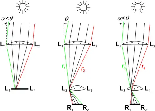 In some applications it is important to achieve a given irradiance (or illuminance) pattern on a target, while allowing for movements or inhomogeneities of the source. Figure "Köhler integrator" on the right illustrates this for the particular case of solar concentration. Here the light source is the sun moving in the sky. On the left this figure shows a lens L1 L2 capturing sunlight incident at an angle α to the optical axis and concentrating it onto a receiver L3 L4. As seen, this light is concentrated onto a hotspot on the receiver. This may be a problem in some applications. One way around this is to add a new lens extending from L3 to L4 that captures the light from L1 L2 and redirects it onto a receiver R1 R2, as shown in the middle of the figure.