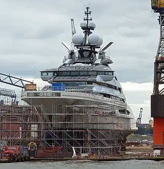 The 142 m (466 ft) superyacht Nord was launched by Lürssen at their yard near Bremen-Vegesack. Both the yacht's exterior and interior design are the work of Nuvolari & Lenard.[2] Nord, formerly known as Project OPUS, was built under the supervision of yacht brokerage Moran Yacht & Ship based in Fort Lauderdale, Florida.[6] The ship belongs to billionaire Alexey Mordashov and is estimated to be worth $500 million.[7] Following Russia's 2022 invasion of Ukraine the yacht sailed to the Seychelles and then on to the Russian Pacific port of Vladivostok to escape seizure by Western authorities.[8]