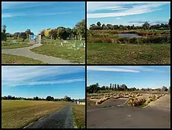 ![]() Areas of Norman Kirk Park – Clockwise from upper left: Kaiapoi Dog Park, Beswick Stormwater Area & The Honda Forest, Sports Fields, and Kaiapoi Community BMX Track | |