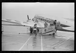 The group said it was "first in aircoach"[64] and credited itself with development of air coach (what we know today as economy class) in late 1945,[65] which was clearly reaching back to the Standard/Viking days. Air coach meant no-frills flights with higher density seating; for instance, on a DC-6, seats were five abreast rather than four,[66] and a DC-4 had 80 seats versus 50–55 originally.[67] North American said it was the first to create space for people to bring carry-on bags, to give coach passenger free meals and make various innovations in passenger handling helped speed people through the airports, including an airstair modification for the DC-3 (see picture) which they referred to as a "drop down door".[68] Also, the partners were able to afford brand-new fast, pressurized DC-6B aircraft, giving the group equipment on par with the certificated carriers. For its part, the Air Transport Association (ATA), the scheduled airlines' club, refused to concede North American had contributed anything to air travel. For instance, in 1956 Congressional testimony the head of the ATA said: "... North American group has done nothing for air transportation; nothing."[69]
