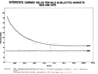 A 1954 study by the Air Transport Association, the scheduled airline trade group (today known as Airlines for America), noted that the North American Group's revenue per airplane mile exceeded that of the trunk carriers (the domestic mainline scheduled airlines), which it attributed to North American running its aircraft at high load factors (87.8% vs 64.5% for the trunks).[62] As discussed in Innovation North American's aircraft also had many more seats. But profits also reflected the CAB's then fare policy. The CAB set fares nationally for all scheduled carriers under its control at a constant amount per mile, regardless of distance (see nearby graph). This ignored underlying economics, that the cost per mile is higher for a short flight than long-flight (since many costs for a flight are independent of length). This meant CAB fares for long-haul flights were overly remunerative (but the CAB forced airlines to fly both long and short flights, essentially subsidizing shorter flights with the longer). North American could undercut CAB fares and still make money, something critics described as "cream-skimmming."[63]