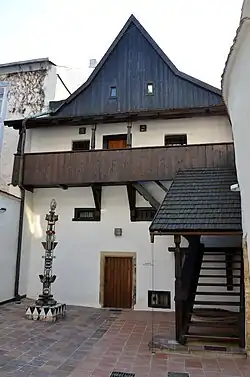In 1976, the gallery acquired house No. 24, at Mírové náměstí 17, which now houses the museum of the Roman Catholic Diocese of Litoměřice. The late Gothic building from 1513 has preserved steep gabled roofs with complex late Gothic trusses. In the courtyard wing, there is a two-story building with Gothic trusses and a wooden gallery, where selected works from the art brut and naïve art collections are installed.