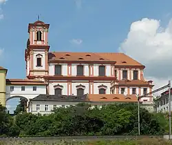 The former Jesuit Church of the Annunciation, built between 1701 and 1731 according to the plans of Octavio Broggio, was used by the gallery for a decade from 1965 to 1975. It housed carpentry and restoration workshops and part of the depositories, but after 1975 the church was due to be reconstructed.[1] However, the planned reconstruction of the church for the needs of the Litoměřice District Archive, which was then located in unsuitable premises in the Small Fortress in Terezín, did not take place in the end. Since 1992, the church has once again been used by the Litoměřice gallery. After four years of art symposia: "Baroque and Today" and "Open Dialogue," in which the Symposion Foundation participated, the church is used during the summer to host exhibitions of sculptures and paintings.[4] Concerts are also held here occasionally.