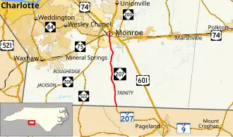 North Carolina Highway 207 (NC 207) is a primary state highway in the U.S. state of North Carolina. It is entirely in the boundaries of Union County and serves to connect the city of Monroe to the city of Pageland, South Carolina, at the South Carolina state line via SC 207.