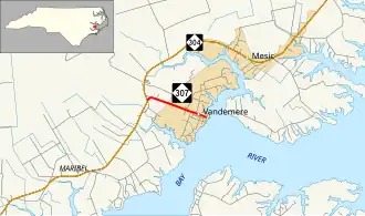 NC 307 is a short 1.4-mile (2.3 km) two-lane road that connects the town of Vandemere with NC 304, at Hollyville (aka Cash Corner). The highway goes through the town's residential area before ending on 1st Street near the Bay River.