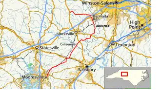 A two-lane rural highway, it traverses 53.9 miles (86.7 km) from Mooresville to U.S. Route 601 (US 601) near Farmington. It links several small towns and communities including Cooleemee, Advance, Farmington, and Bermuda Run.[1]