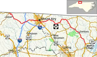 North Carolina Highway 89 (NC 89) is a 61.3-mile-long (98.7 km) primary state highway in the U.S. state North Carolina including Mount Airy and Danbury. The entire route spans only two counties in the state: Surry and Stokes. It can be accessed from the Blue Ridge Parkway via Virginia's State Route 89 (the highway that continues from NC 89's western terminus) or an interchange with NC 18 which intersects NC 89 near its western terminus. Interstates 74 and 77 both intersect NC 89 west of Mount Airy.