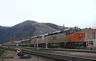 The train was one of many routes to receive the new EMD SDP40F, which worked the route between 1974 and 1977, although older EMD E8 and EMD E9s continued to be used.[74] A series of derailments involving the SDP40F prompted their replacement, and by late 1977 Amtrak had introduced the EMD F40PH. These sometimes ran with an E9 "B" unit as well.[75] In late 1976 a typical North Coast Hiawatha departed Seattle with two SDP40Fs, a baggage car, two 44-seat long-distance coaches, a Budd dome coach, one of the dormitory-coffee shop cars formerly used on California Zephyr, an ex-North Coast Limited dining car, and a single Pacific series sleeping car. Two more baggage cars were added at Minneapolis for mail and express service.[76]