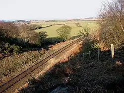 Starting from Sheringham station, the lines follows the coast westwards, soon passing over the Automatic Open Crossing at Sweetbriar Lane, where the private road leading to Sheringham Golf Club crosses the line.[35] The line climbs a 1 in 97 gradient, with the golf course, and Skelding Hill,[36] on the seaward side of trains, while the A149 can be seen on the landward side of trains, roughly paralleling the tracks with Upper Sheringham visible in the distance. During WW2, Skelding Hill was the location for an emergency coastal battery, complete with an underground headquarters bunker.[37]