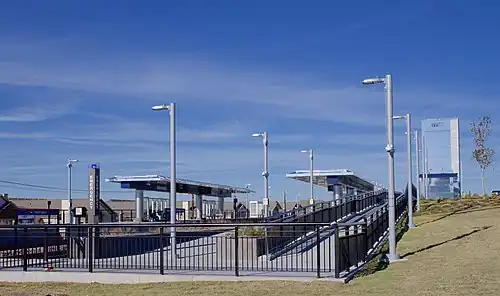 North Richland Hills/Iron Horse was an opening day station[1] when revenue service began on December 31, 2018.[2] A mixed-use, transit-oriented development, Iron Horse Village, is in the works nearby, which would include up to 469 apartments, office buildings, a commercial area, restaurants, shops, and bakeries. The development would cost $70 million, would be 100 acres large, and the first apartments would be available in the spring of 2017, roughly 1 year before the station's opening.[3]