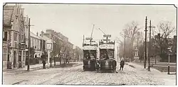 Trams at the Cock Hotel, Kingsthorpe, Northampton, circa 1905