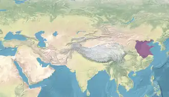 The Northern Qi, although founded by a ruler of mixed Han/Xianbei origin, strongly asserted their Xianbei ethnic cultural identity. They regarded surviving ethnic Tuoba (themselves also Xianbei) and non-Han of the Northern Wei court and as well as literati of all ethnicities as near Han, referring to them as Han'er or Han kids (漢兒).[10] However they employed Han and sometimes Central Asian courtiers.[23] While some Qi elite families had expressed strongly anti-Han sentiments due to unclear reasons, they may also lay claim to Han elite origin.[8] Emperor Wenxuan's father Gao Huan himself said different things to Han and Xianbei, saying to the Han Chinese that "The Xianbei are your clients, you give them a measure of grain and a bolt of cloth, and they fight for you and enable you to have peace and order, why do you hate them?" and he said in Xianbei to Xianbei people that "The Chinese are your slaves, they [the men] farm for you, the women make your clothing, they bring you your supplies and clothing, keeping you warm and full, why do you want to suppress them?".[24][25] Gao Huan was descended from the Gao family of Bohai (渤海高氏), of ethnic Han descent in what is now modern Hebei.[26] He had become Xianbeified as his family had lived for some time in Inner Mongolia after his grandfather was relocated from Bohai.[27][28]
