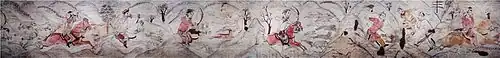 Murals from a tomb of the Northern Qi dynasty (550-577 AD) in Jiuyuangang, Xinzhou, showing a rural hunting scene on horseback.[22]