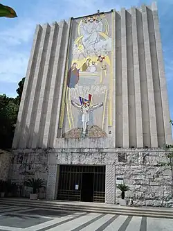 The church was designed around 1950 by Bruno Apollini Ghetti. The façade mosaic is by Marko Ivan Rupnik. There is a small raccoon in the bottom right hand corner. The church contains a high altar designed by Francesco Nagni, ceramic decorations (including a fine crucifix) by Angelo Biancini. Biancini's terracotta ambo has panels depicting The Last Supper and the Madonna and Child. The stained glass windows are by János Hajnal and Marcello Avenali.