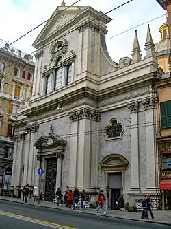 A church of ‘’Our Lady of the Consolation’’ under the care of Augustinian Fathers was known near this site since the 15th century. At the time, it stood in the perilous neighborhoods outside the city walls. Construction of new defensive walls after the bombardment in 1684, forced the Augustinian monks to relocate, and they were authorized to build at the present site. Construction ran from 1684 till 1706. The dome was added in 1769 based on designs by Simone Cantoni. The adjacent monastery, never completed, became in the 19th century the site of a marketplace called the Mercato Orientale. In 1810, under Napoleonic rule, the Augustinians were dispossessed of the church, and by 1813, it became a parish church. The interior frescoes date to after 1875. Inside the first altar to the right has a canvas depicting St Thomas of Villanova distributing his wealth to the poor by Domenico Fiasella. The virgin statue on the façade was moved here from the prior church. The organ was built by Giacomo Locatelli in 1880 and restored in 1975.