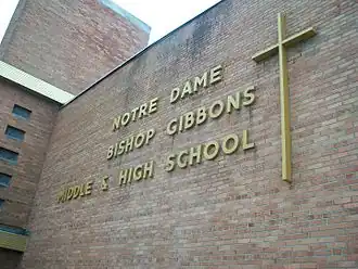 Bishop Gibbons High School was established in 1958 as an all-boys school. Bishop Gibbons was founded by the Irish Christian brothers. Notre Dame High School was established in 1960 as an all-girls high school.[2] Bishop Gibbons and Notre Dame merged in 1975. Grades 7 and 8 were added in 1989 and Grade 6 was added in 1996. They won the Class B NYSPHSAA State Men's Cross Country Championship in 2012. The first state championship in school history was in 1986 when the Girls' basketball team won the Class A NYSPHSAA tournament.[3] The school principal is James Mahoney.