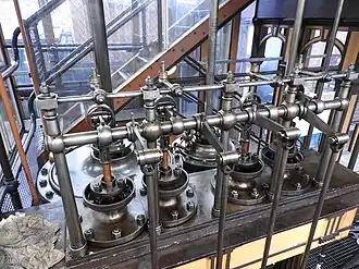 The Steam Gallery[12] contains a Basford Beam Engine, one of a pair of engines built in 1858 by R. W. Hawthorn in Newcastle upon Tyne. It was installed at Basford Pumping Station to lift water 110 ft from the sandstone below to supply fresh water to the City of Nottingham. The engine was replaced in 1965 and was removed to the purpose-built Steam Gallery where it was first fired in 1975. Also in this building today are a variety of pumps and engines, many of which were removed from local companies; for example E. Reader & Sons of Phoenix Engine Works, Cremorne Street, Nottingham (Makers of high-speed stationary steam engines).[13] At the bottom end of the gallery stand two ploughing engines. These have consecutive registration numbers and were the last two production engines to come out of Fowlers Leeds Foundry. Owned by Nottingham City Council, they were used for ploughing the treated sewage into the land at a large dairy farm at Stoke Bardolph. One of these engines is operational and is used at the steam up events. Next to the ploughing engines is a J. T. Marshall Portable steam engine, built at the Nottingham Engineering Works, Sandiacre, in 1886. It has been restored to full working order and can be seen operating at the steam up events.