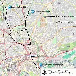 The construction of the second line began almost immediately after the opening of the first. A formal ceremony took place on 23 September 1878 when Miss Bella Winby, the daughter of the patentee of the track system proceeded to raise the first stone with a miniature pick prepared specially for the occasion. The spot selected for this ceremony was in the centre of the road a small distance above St. John's Church, Carrington and exactly opposite the plot of land purchased by the company for the depot and stables. Work moved quickly and on 3 April the works were inspected by the Board of Trade and authorised for opening on Saturday 5 April 1879. The route was via Long Row, Market Street, Parliament Street, Milton Street and Mansfield Road, with a branch along Forest Road. The Carrington route was not connected to the southern route, and it had its own depot and stables between St John’s Church and Watcombe Road. This site was subsequently redeveloped into The Carrington Lido open-air swimming pool (1937–1988),[7] then into a children's playground and, later still, redeveloped into a residential retirement development.[8][9][10]
