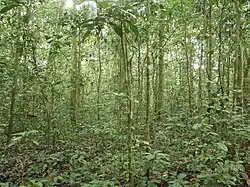 Nouable-Ndoki National Park is a lush rainforest with 24 distinct types of vegetation. The plants include a collection of different types of mahoganies.[4] However, the dominant trees are Gilbertiodendron dewevrei in the upland region and away from water courses in large areas. Mixed and swamp forests are also a feature. The forest has many “bais”, or cleared areas. Over 1000 different plant and tree species have been identified.[3][15] G. dewevevri produces a supra-annual seed crop and it is “thought that mast fruiting may have occurred to combat seed predation through predator satiation.” These seeds are destroyed by beetles. However, they form the major food source for a large number of mammals such as rodents, duikers, red river and giant forest hogs, buffaloes, elephants and, particularly, gorillas.[16]