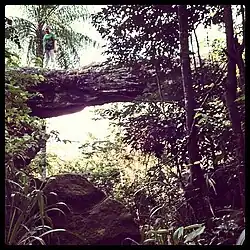 Ponte de Pedra: Geosite Ponte de Pedra is located in Sítio Olho D'água de Santa Bárbara is a remarkable site in the landscape, with a beautiful panoramic view, located in the municipality of Nova Olinda, on the descent of Chapada do Araripe. It is represented by a natural rock formation that resembles a bridge, as it covers the gap of a stream that only has water in times of rain. It delimits an area between the Chapada de Araripe, with its abundant forest and the culture of collecting pequi, and the Sertão, which can be seen on the way down. The bridge probably served as a trail for the ancient populations, both for the Indians and for the former cowboys who colonized the region. Near the bridge, there are archaeological remains of prehistoric populations. There are engravings and cave paintings, as well as occasional finds of ceramic remains and lithic material used by the ancient Kariri inhabitants. It is one of the places where the geological and natural past can be studied together with human history.