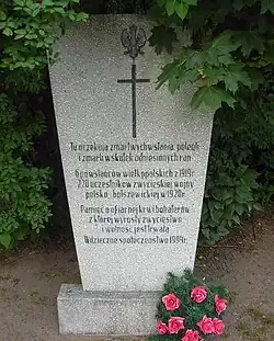 The hostages murdered at the Old Market Square were buried in the cemetery. In their graves were placed objects or "distinguishing marks" in special boxes, thanks to which, after the war, the exhumed bodies could be identified.[5]