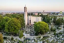 In 1971, a new Catholic pastoral center was established, with the Nowofarny cemetery chapel as its seat. On December 1, 1979, the Parish of the Holy Cross in Bydgoszcz was created: following dragging troubles to consent on the location of the new church, it was decided to rebuild the cemetery chapel between 1982 and 1986.[10] The project led by Father Prelate Eugeniusz Barełkowski was carried out following the design of Bydgoszcz engineers Jerzy Tomaszewski (main building) and Zbigniew Lewiński (towers).