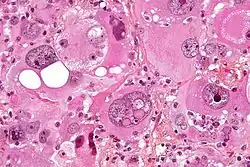 Nuclear atypia refers to abnormal appearance of cell nuclei. It is a term used in cytopathology and histopathology. Atypical nuclei are often pleomorphic.