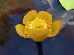 Nuphar × spenneriana is a perennial, rhizomatous, aquatic plant.[2] The leaf blade is 7–18 cm long, and 5–14 cm wide.[3] The abaxial leaf surface has trichomes towards the leaf margin[4][3] but trichomes are absent towards the centre. Trichomes also may be absent entirely.[3] The leaf has 15-22 primary nerves.[5] The petiole is 3–7 mm wide.[3]