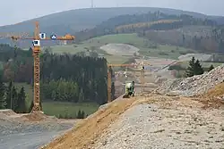 Work on the Müß Tunnel commenced on 29 February 2008.[77] At the beginning of April 2008, Deutsche Bahn called tenders for the construction of the Masserberg, Rehberg, Kulch and Lichtenholz tunnels and the Dunkel, Reh and Mühlbach viaducts in September and November 2008 respectively.[78][79] By the end of 2008, all major civil engineering projects[65] and the construction of all "construction time-determining civil engineering works" would be awarded.[77] At the end of January 2009, the DB advertised tenders for the section from track-kilometre 15.8 to 18.0 (near Coburg) and the first 1.8 kilometre of the Coburg southern connection, each including one tunnel.[80] The invitation to tender for the integration of the line into the Erfurt node followed in July 2009.[81] This was to be carried out in nine stages with train operations continuing and was scheduled to be completed in 2017.[82]