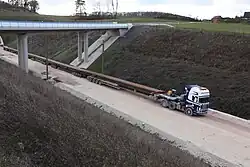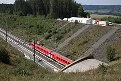In June 2013, the Dörfles-Esbach connecting curve was connected to the existing network, in order to be able to carry the rails for the construction of the line, among other things.[97] The rails of the new line came from several large German track manufacturers and some were carried by goods trains on the lines from Coburg[98] and Erfurt.[99] At the end of November 2014 Deutsche Bahn announced that all 29 bridges on the new line had been completed.[100]