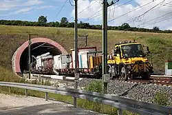 Unloading of long sections of rail at Coburg, November 2013Tunnel cleaning train in front of the Eierberge tunnel, June 2016