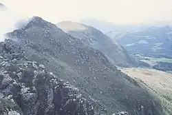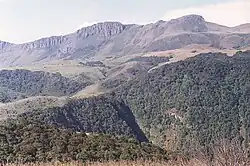 Most of Nyanga National Park is underlain by granite.[12] The highest mountains are composed of Umkondo Group dolerite and sandstone, with the harder dolerite forming cliffs and ridges[13] and the granite-dolerite contact often forming waterfalls.[14] The Troutbeck dolerite sill,[15] shown in the distance in the photograph of Kwaraguza above, was dated at 1099 Ma.[16]