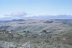 Mount Nyangani from the west. The main hiking route, the "Tourist Path", goes from the building on the far right and ascends to the left of the summit plateau on the skyline.