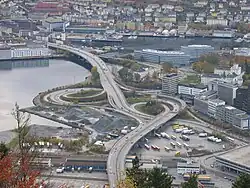 Nygårdstangen is a small peninsula on the southeastern end of the city center of Bergen in Vestland county, Norway. The neighborhood borders the Store Lungegårdsvann bay. Most of the peninsula is occupied by an interchange. It is the meeting place of E16, E39, and National Road 555. To the northeast, the Fløyfjell Tunnel, where E16 and E39 run commonly, mouthes out into interchange, as does E39 from the south via the Nygård Bridge. To the west, 555 terminates at the intersection, arriving via the Nygård Tunnel. The interchange also allows access to the city center via Fjøsangerveien. Also located at Nygårdstangen is Bergen Fire Station and one campus of the Bergen University College.