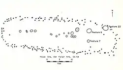 A total of 8 house structures and 17 features were identified during the 1958 excavations. The house structures ranged from 25 to 47.5 feet long and 12–15 feet wide. Some of the houses had pit features as well (fire pits and refuse pits).[2]