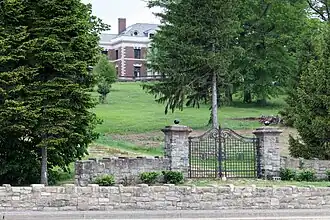 ![]() Southwest facade of Oak Hill, behind the original west gate. A low modern wall is in the foreground. | |