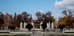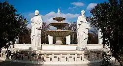 The Fountain of the Apostles features twelve marble statues of the Apostles of Christ surrounding the inner font.