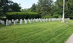 There is a Soldiers' Lot near the center of the cemetery,[12] which is administered by the U.S. Department of Veterans Affairs.[13] At one time 174 soldiers were buried at Oakdale, including the first Iowans to die in the Civil War at the Battle of Fort Donelson.[14] Most of the bodies were transferred in 1888 to Rock Island National Cemetery or Keokuk National Cemetery. The remaining 14 soldiers' graves were moved to the Grand Army of the Republic (GAR) plot in 1900. The plot was transferred from the GAR to the cemetery association in 1940 and the United States government took possession of it the following year. Today it contains the remains of 71 soldiers from the Civil War and Spanish–American War.[14]