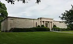 The cemetery is also home to several private mausoleums. William D. Petersen was the son of J.H.C. Petersen who founded a department store in Davenport that has become Von Maur. He also was responsible for the development of the city's riverfront and built the LeClaire Park Bandshell there. His mausoleum was designed in the Gothic Revival style by Davenport architects Rudolph Clausen & Walter Kruse. It was inspired by his wife Sara's desire for a tomb similar to the ones she saw in Europe. It was constructed by Presbrey Leland of Valhalla, New York in 1921 for $60,000.[11] The exterior is composed of limestone from Greece. The interior features crypts that were carved from Greek marble and a ceramic tile ceiling that was designed and completed by the Guastavino Tile Company of Woburn, Massachusetts.