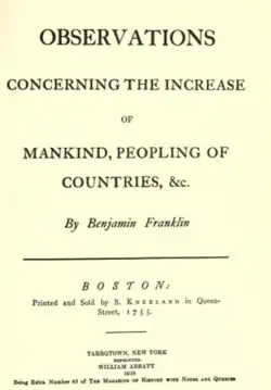 Observations Concerning the Increase of Mankind, Peopling of Countries, etc. is a short essay written in 1751 by American polymath Benjamin Franklin.[1] It was circulated by Franklin in manuscript to his circle of friends, but in 1755 it was published as an addendum in a Boston pamphlet on another subject.[2] It was reissued ten times during the next 15 years.[3]