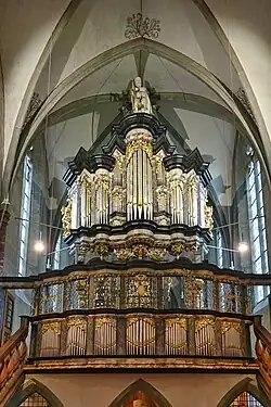 An organ, likely a swallow’s nest type, was first mentioned in a memorial foundation by Dean Wilhelm Freseken.[80] Contrary to some claims, the source does not confirm Freseken’s donation. The organ was expanded in 1499, possibly alongside a larger second organ. By 1585, a spring-chest organ with two manuals was recorded. On February 2, 1586, Dutch troops under Martin Schenk von Nideggen raided the monastery, destroying the organ. In 1599, Paderborn Prince-Bishop Theodor von Fürstenberg donated two new organs to his sister, Prioress Ottilia.[81] Marten de Mare built the new organ in its current location, reusing undamaged material from the earlier instruments.[82] Johann Berenhard Klausing from Herford began renovation and expansion in 1713, completing the work in 1717, with the organ casing crafted by Spliethoven and La Ruell.[83]