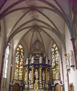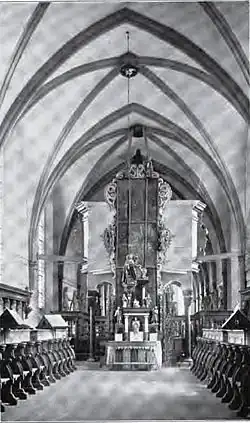 The current Gothic church, built in the 14th century, is a single-nave, nine-bay hall with a 5/8 choir.[68] The nave was constructed in three phases, with the choir and nave uniformly vaulted with cross-ribs and keystone accents.