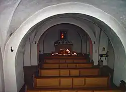 Restoration work from 1957 to 1960 revealed Gothic wall and ceiling paintings from the late 15th century. Older white-gray surfaces with painted red quadring and vine ornaments around the keystone remain, alongside plant-like vault decorations, two angels, and other elements from 1499. A large depiction of Saint Christopher, rediscovered in 1933, dates to the early 16th century.[71]