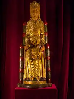 The Marian statue in the crypt, known as the “Dear Lady of Cologne,” “Queen of the Sauerland,” or “Kölsche Madonna,” dates to the early 13th century. The seated Virgin, clad in a long robe, faces forward, with the Christ Child, added in the Middle Ages, holding a book and raising a blessing hand. The 57 cm statue, including the throne, had its hands, Child, and crown replaced, with a 1976 color scheme based on recent art-historical studies. A comparable, slightly later statue exists in the Merklinghauser Kapelle.[74][75]