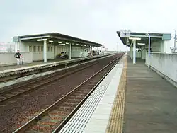 The JGR became the Japan National Railway (JNR) after World War II. Freight operations were discontinued due to Kinuura Rinkai Railway Handa Line commencing operations and the freight-only line between the two lines were deconstructed on November 15, 1975. Small parcel operations were terminated on February 1, 1984.[4][6] With the privatization and dissolution of the JNR on April 1, 1987, the station came under the control of the Central Japan Railway Company. Automatic turnstiles were installed in May 1992, and the TOICA system of magnetic fare cards was implemented in November 2006. On February 19, 1995, the station and the nearby section was elevated.[7] Station numbering was introduced to the Taketoyo Line in March 2018; Ogawa Station was assigned station number CE02.[8][9] As a part of JR Central's aim to make every station with more than 3,000 users per day accessible, a pair of elevators and multipurpose toilets have been installed in 2020.[10][11]