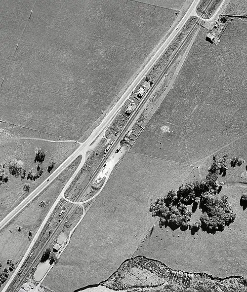 A goods shed was built in 1893.[5] When New Zealand Railways Department took over in 1908, tablet signalling was introduced. The station was improved in 1909, the platform extended south by 2½ chains and cattle yards built, so that by 1911 it had a shelter shed, platform, cart approach, 25 ft (7.6 m) by 13 ft (4.0 m) goods shed, loading bank, cattle and sheep yards and a passing loop for 56 wagons (extended in 1913 to 70 wagons, in 1940 to 90 wagons and in 1956 to 100 wagons).[10] Electricity was connected in 1930.[11]